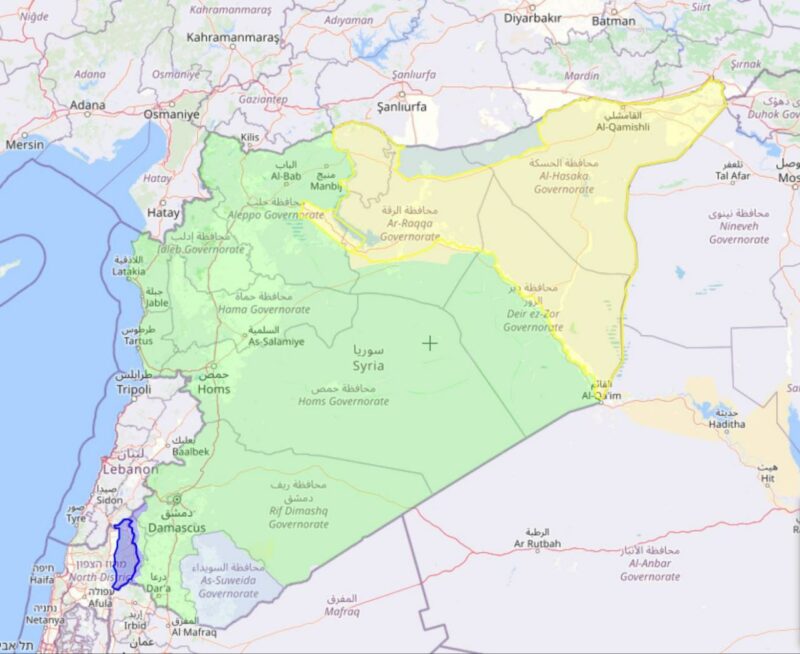 Maps depicting the situation two weeks ago and currently: In Green: Areas controlled by the Syrian Government, in yellow, those dominated by the Syrian Democratic Forces.
